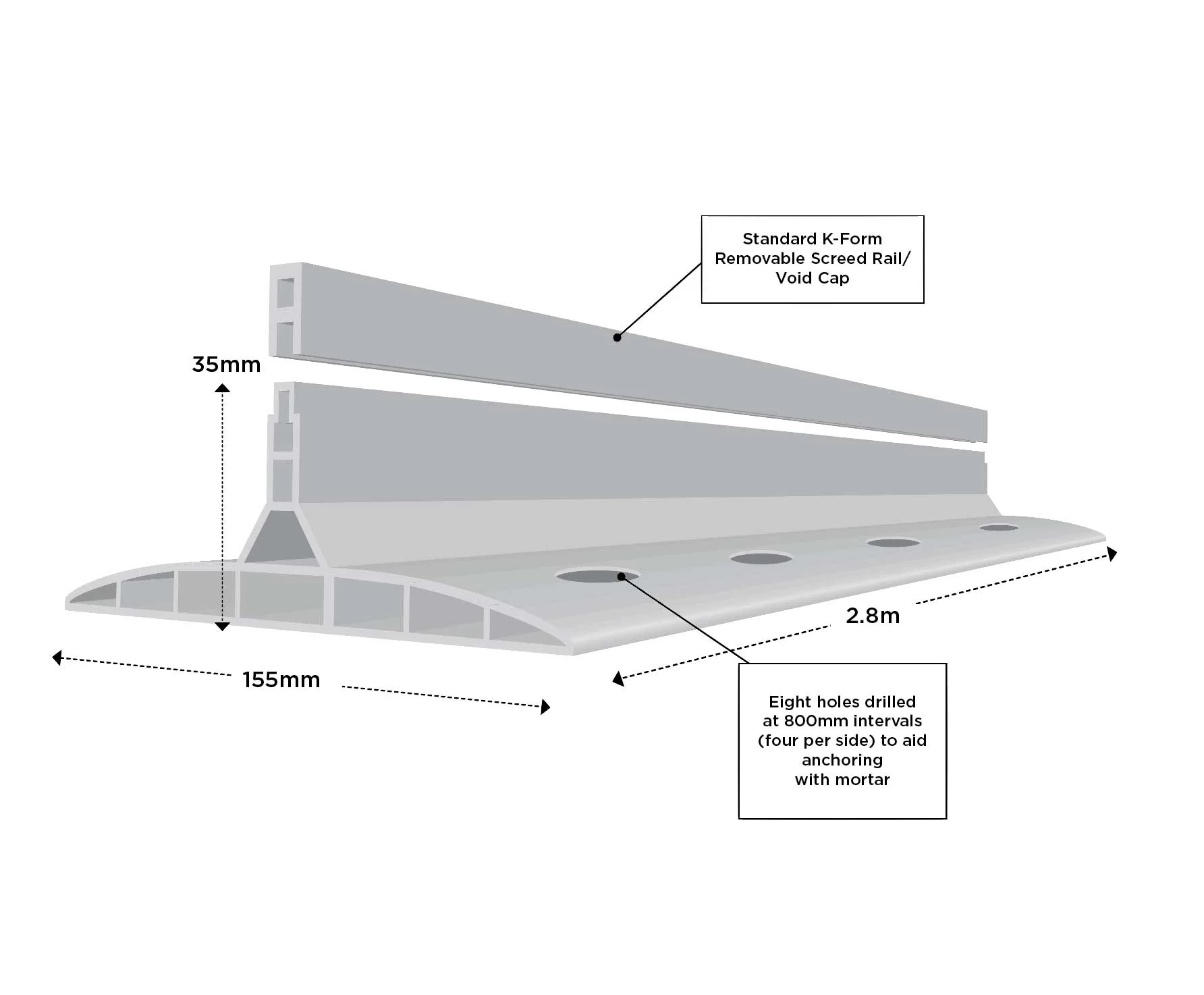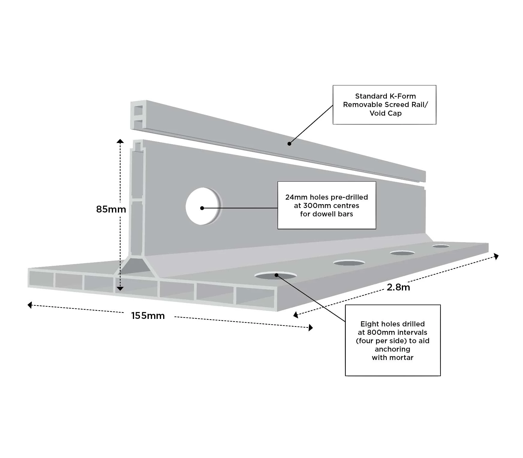 K-Form is made from uPVC. In simple terms it’s a lightweight cast in-place permanent screed rail that’s strong enough to handle all types of conventional mechanical screeds. It’s fast and easy to put in place. Plus it provides control, construction and isolation joints. In other words, you set up, pour and the K-Form simply stays in the ground.