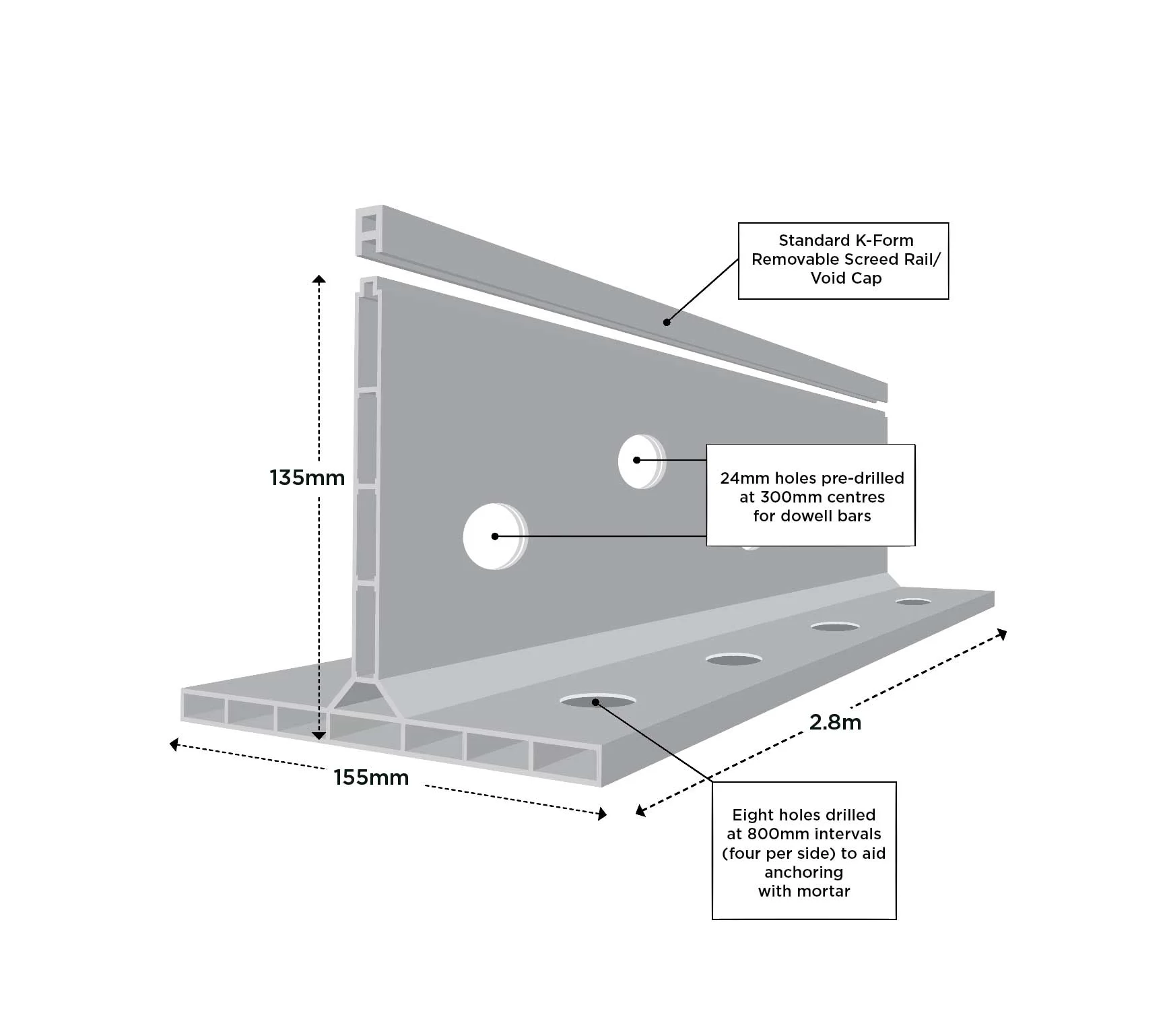 K135 plus 25mm riser recommended for forming 200 - 250mm concrete slabs. Enables adjoining bays to be poured consecutively.